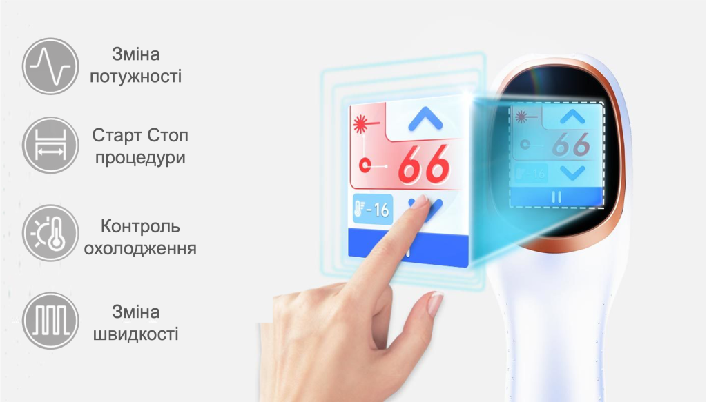 Лікар-косметолог зможе керувати потужністю охолодження та слідкувати за зміною температури “на ходу” завдяки додатковому дисплею вбудованому в насадці