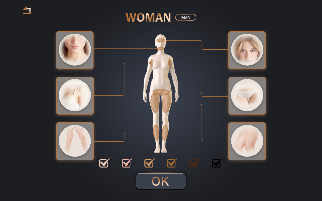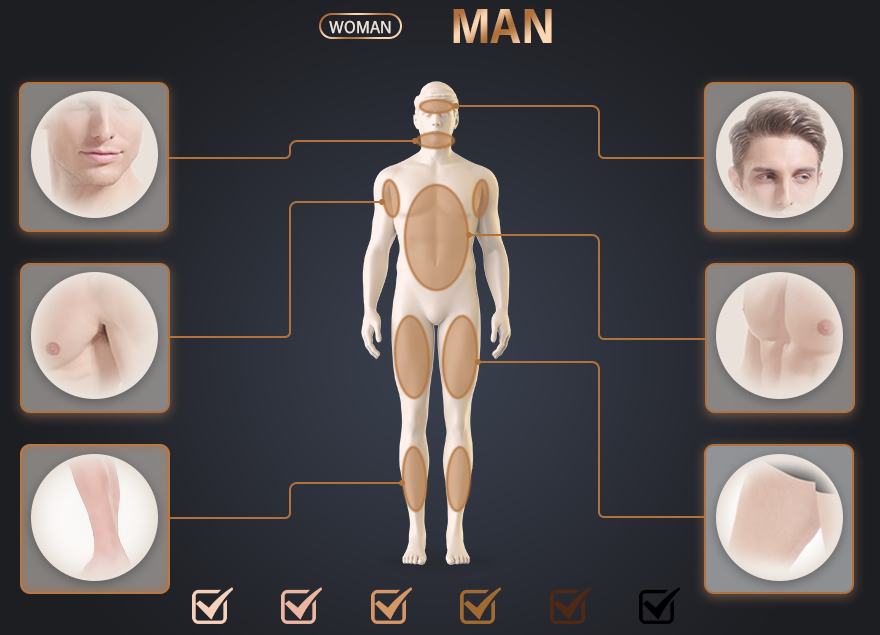 змінним аплікаторам та фокусованому променю, апарат ефективно працює на будь-якій ділянці тіла, з усіма фототипами шкіри та з усіма кольорами волосся будь-якої товщини.